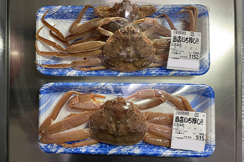 写真の角度でサイズが分かりにくいですが、下の詰めの大きい方がズワイガニ、上がセコガニです。