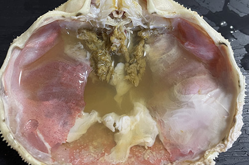 甲羅を外したところ。エラもまっ白でキレイ。ちょっと実入りが少ない方かな。